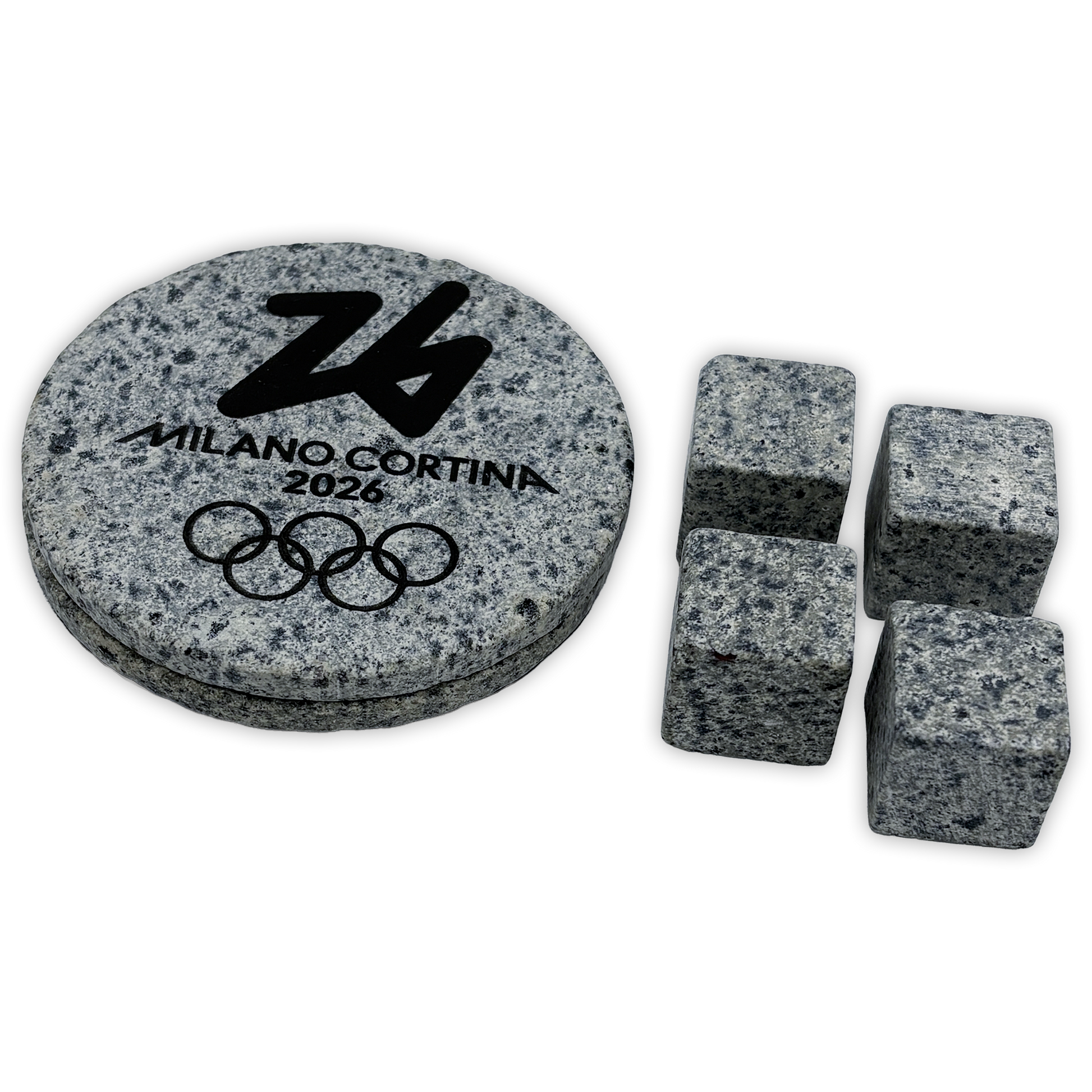 2 sottobicchieri in granito e 4 cubetti refrigeranti in granito.
